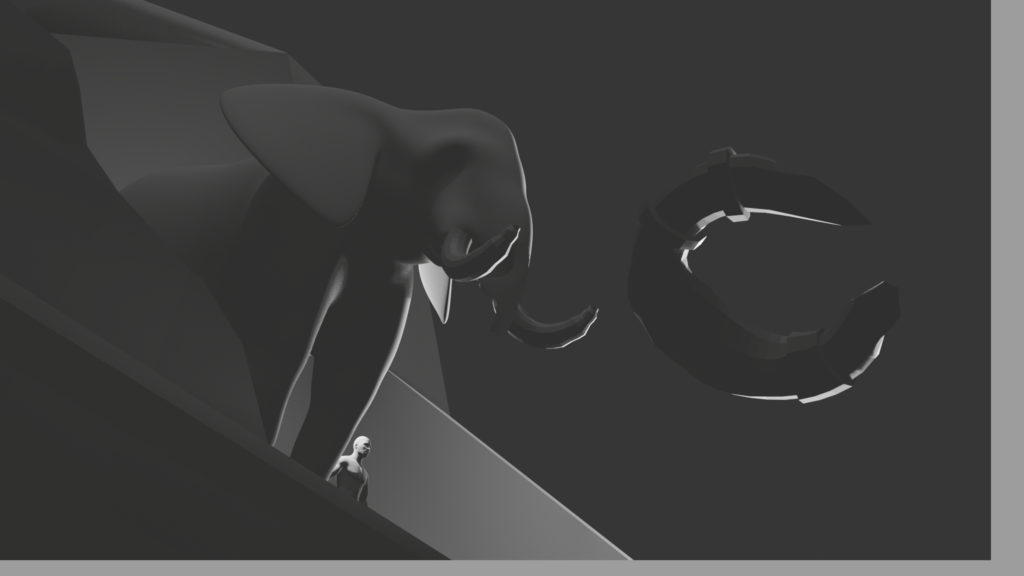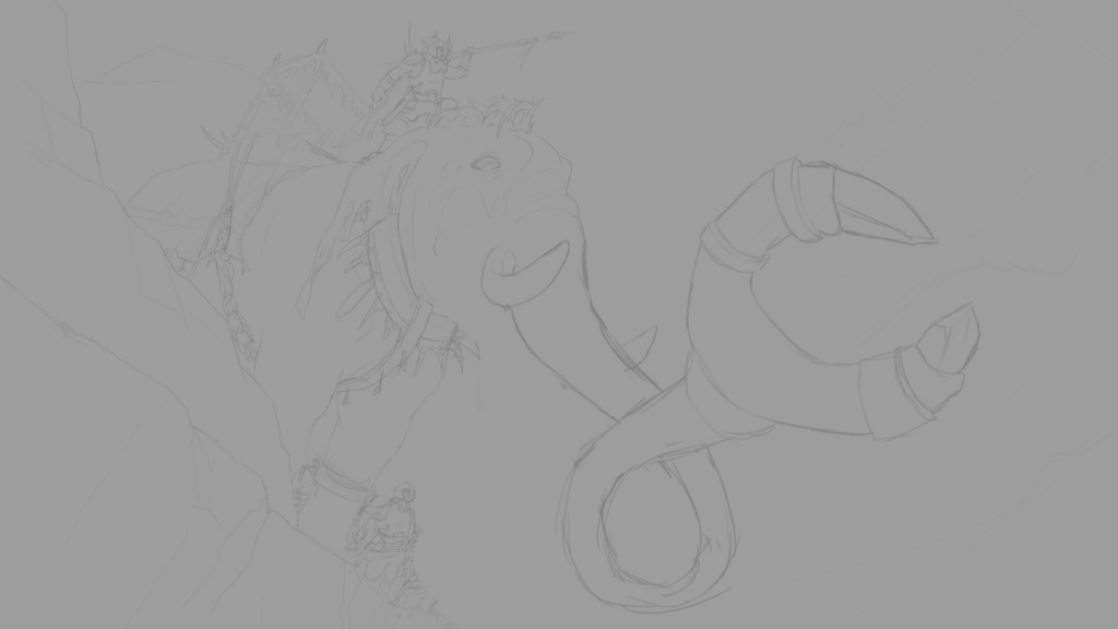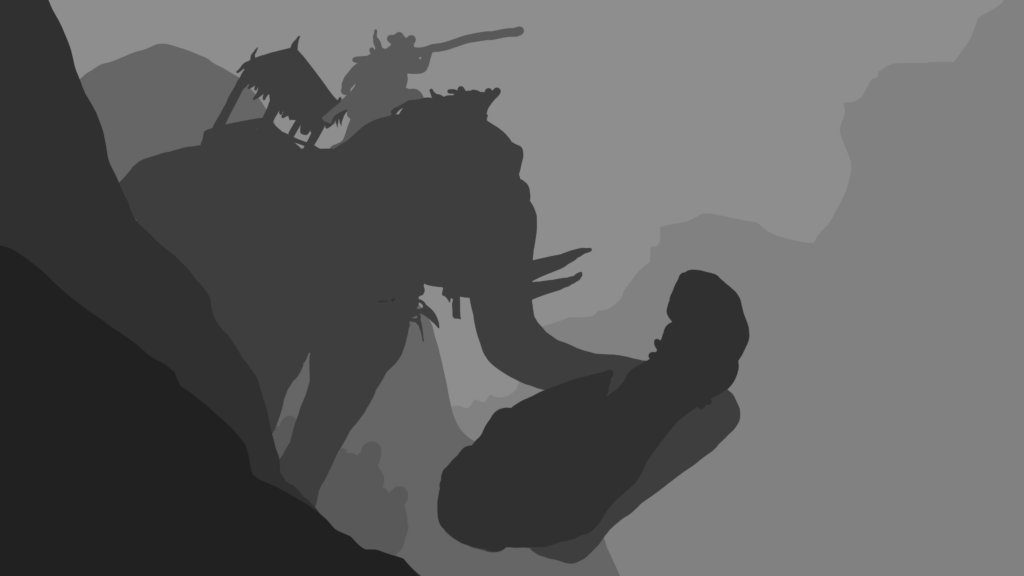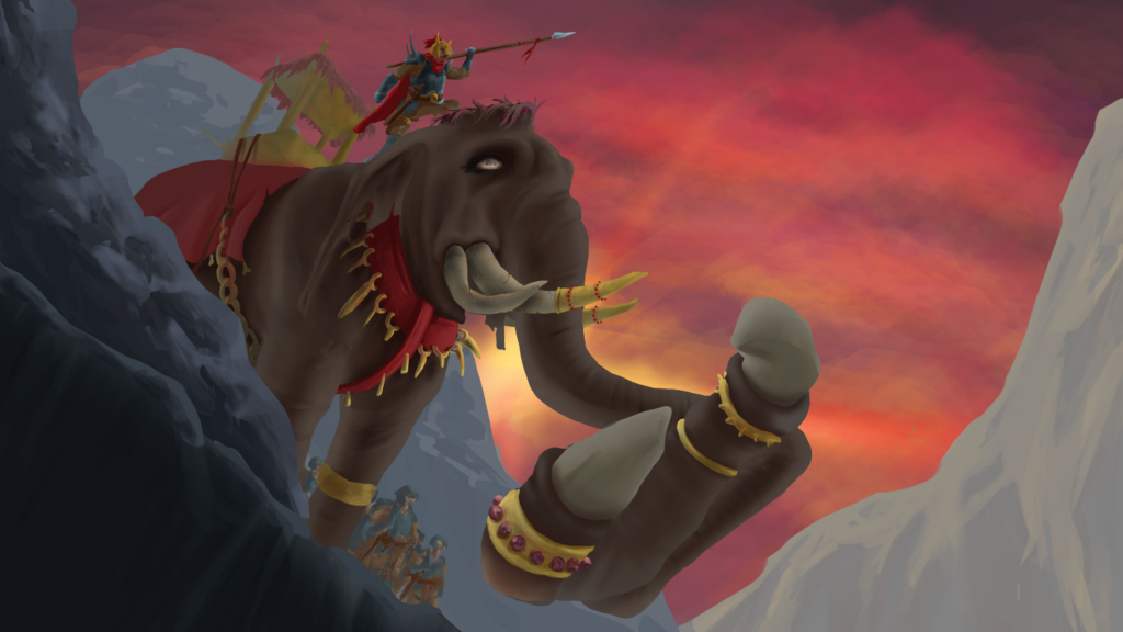 This scene is inspired by the story of Hannibal, who crossed the alps at 218 b.c. using 37 elephants to carry soldiers and their equipment. It’s still totally fictitious, I didn’t even picture a real elephant but a creature I designed one year before for another task. You can find the creature design at the concept tab.